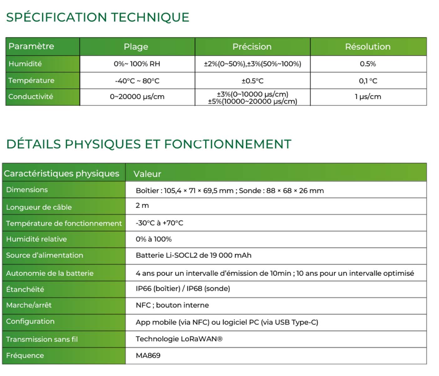• Connectivité LoRaWAN® offrant une portée allant jusqu'à 10 km, idéale pour des zones éloignées.