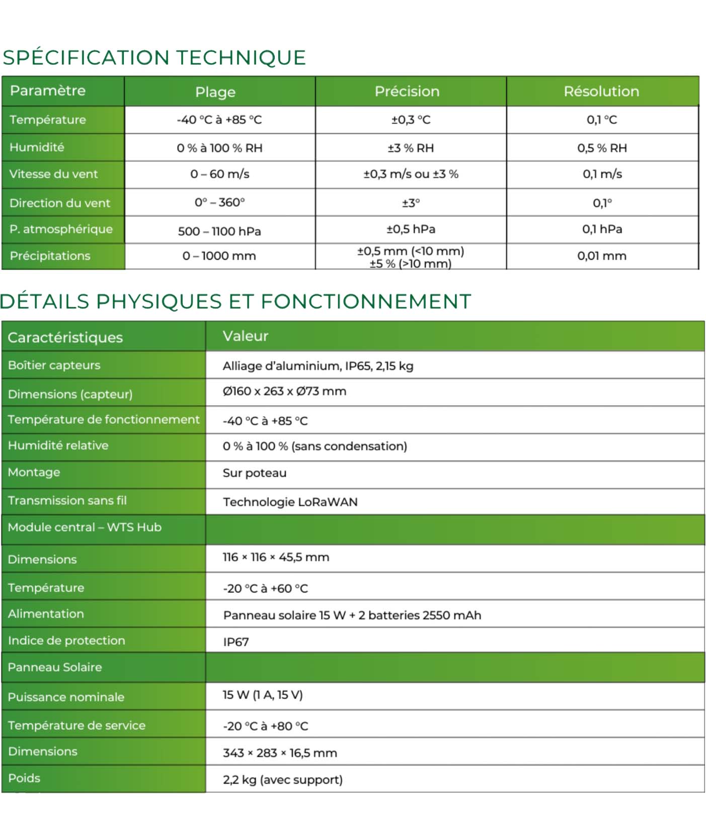 Grâce à sa transmission sans fil jusqu'à 15 km, son alimentation solaire, et une batterie de secours intégrée, la WTS506 offre une solution autonome, robuste et facile à installer pour la surveillance météorologique dans les secteurs agricoles, météorologiques ou industriels. Elle est entièrement compatible avec la plateforme AgroloT pour une gestion à distance centralisée.